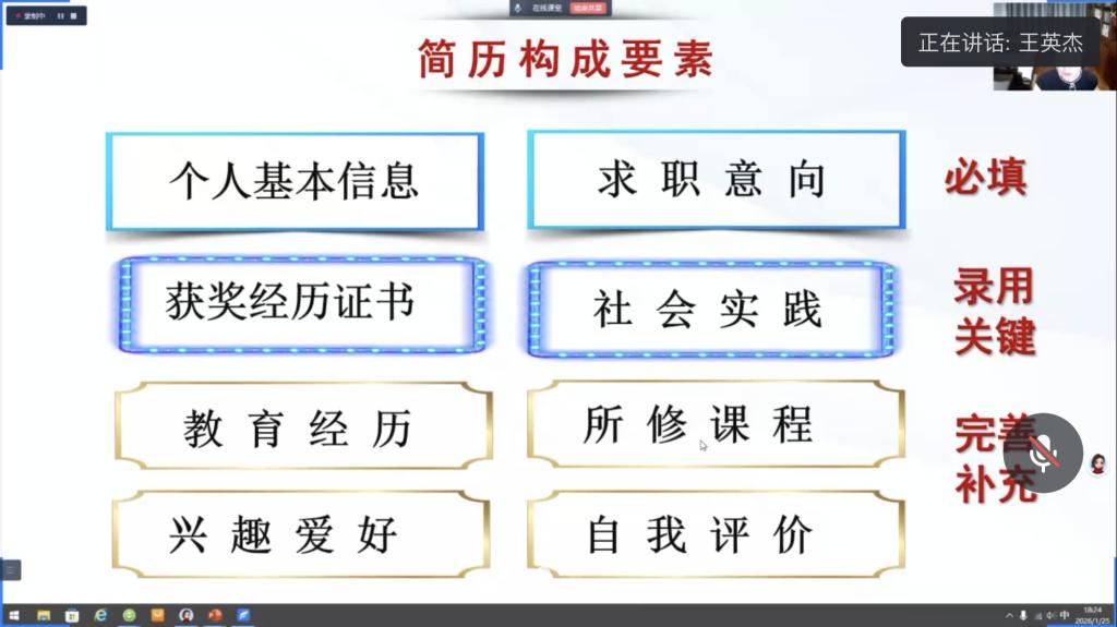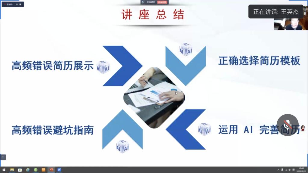 为切实推进2026届毕业生就业工作,破解毕业生求职简历撰写痛点、难点,提升简历制作质量与求职竞争力,1月25日,护理系于线上开展“AI赋能求职简历”专题讲座,主讲人为学校人文社科部创业就业指导教师王英杰。王老师聚焦护理专业求职场景,结合行业招聘要求与往届毕业生求职案例,从高频错误简历展示、高频错误避坑指南、正确选择简历模板、运用AI完善简历四大维度,通过实例分析、经验分享、实操演示的方式,为全体26届毕业生带来干货满满的简历撰写指导。