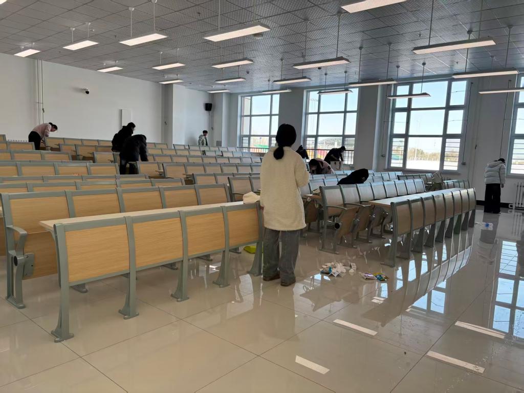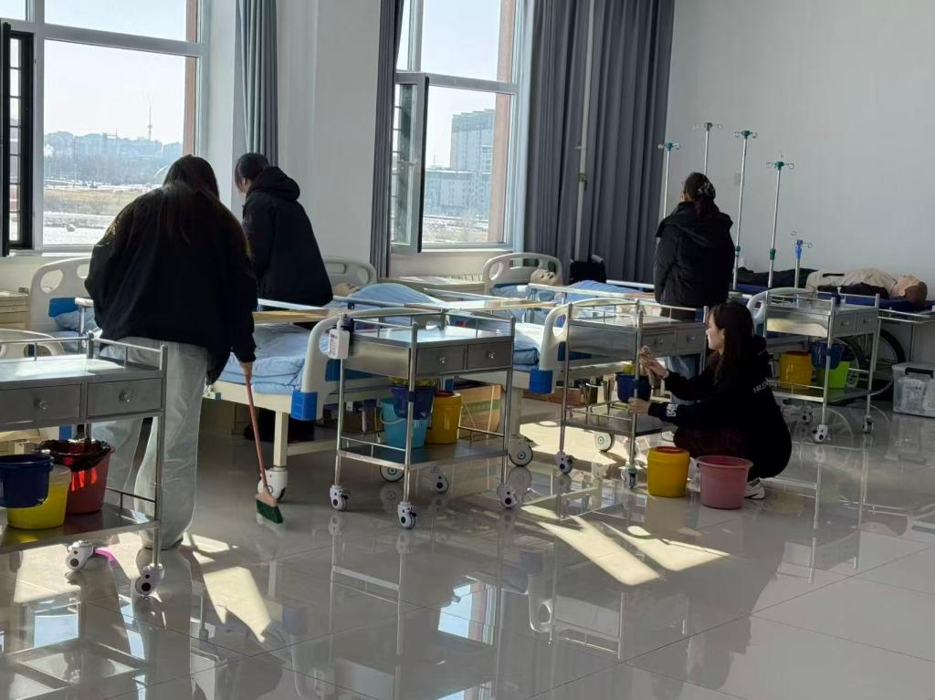 活动中,志愿者们迅速投入工作。实训中心内,大家细致擦拭每一辆治疗车,规范整理摆放各类实训用品;体测室里,地面、暖气片缝隙及边角的杂物积尘均被彻底清理;教室内,志愿者认真擦拭黑板、讲台与课桌椅,细心整理桌洞杂物,清扫地面垃圾、擦拭门窗玻璃,不留一处卫生死角;会议室中,大家全面清扫整理,重点擦拭门窗、桌椅、书架,对座椅下方、墙角、缝隙等易忽略部位逐一清洁。志愿者们尽职尽责、团结协作,高效完成各项工作,为学习、实训教学、体质测试、会议开展等活动营造了整洁舒适的环境。