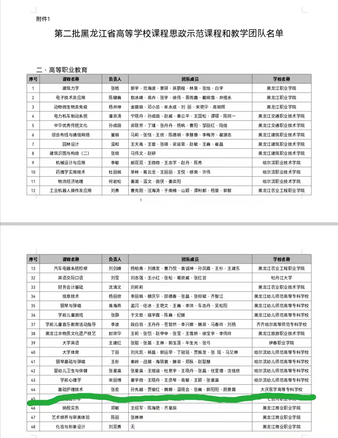 近日,黑龙江省教育厅关于公布第二批黑龙江省高等学校课程思政示范项目名单及启动首批课程思政示范项目验收工作的通知,确定第二批黑龙江省高等学校课程思政示范课程和教学团队170门,我校《基础护理技术》成功入选。