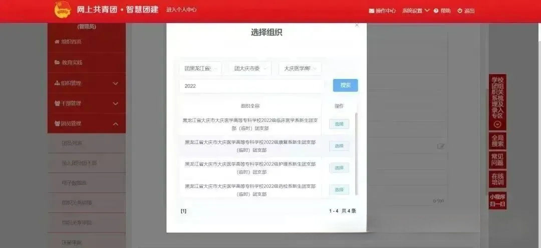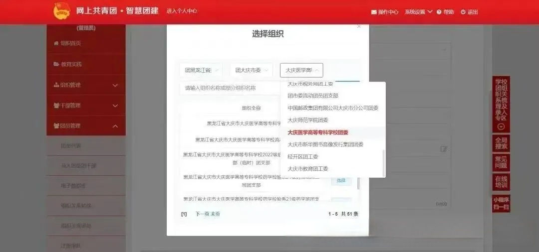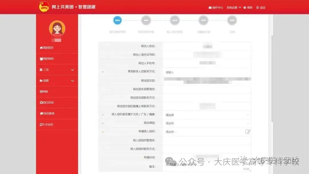 转出原因选择“升学”。申请转入组织选择“团黑龙江省委”→“团大庆市委”→“大庆医学高等专科学校团委”。