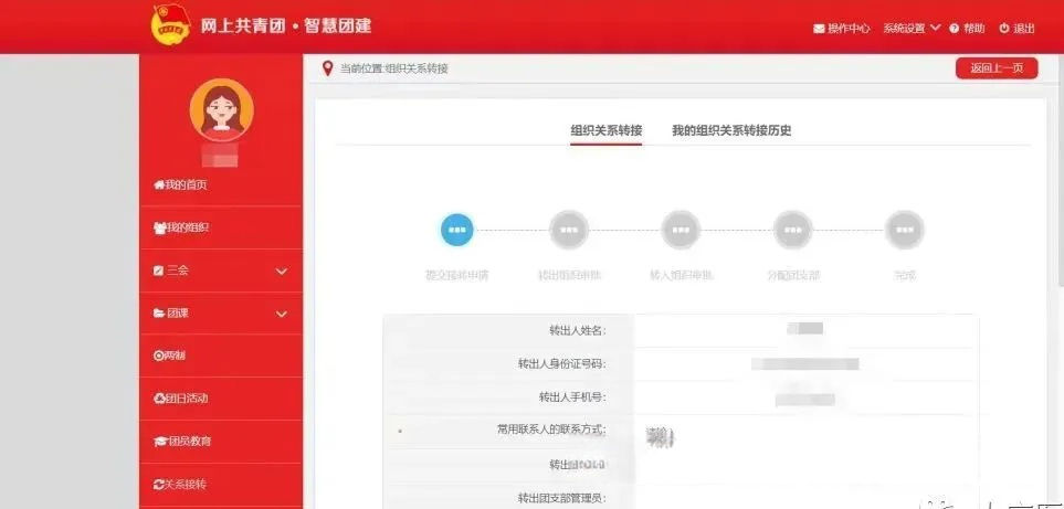 (3)发起转接申请在"申请转入组织"栏选择现所在学院班级团支部。