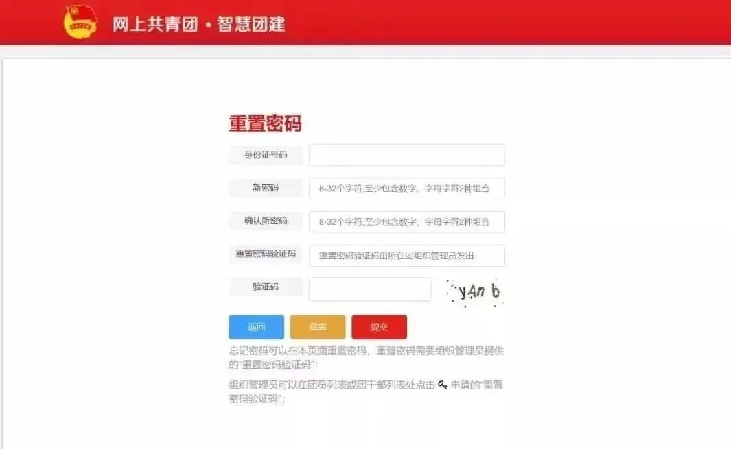 首次登录会提示修改密码若遗忘密码。在登录页面点击“忘记密码” 并联系原团支部管理员 生成“重置密码验证码”,随后填写下图内容提交 即可重新找回密码。