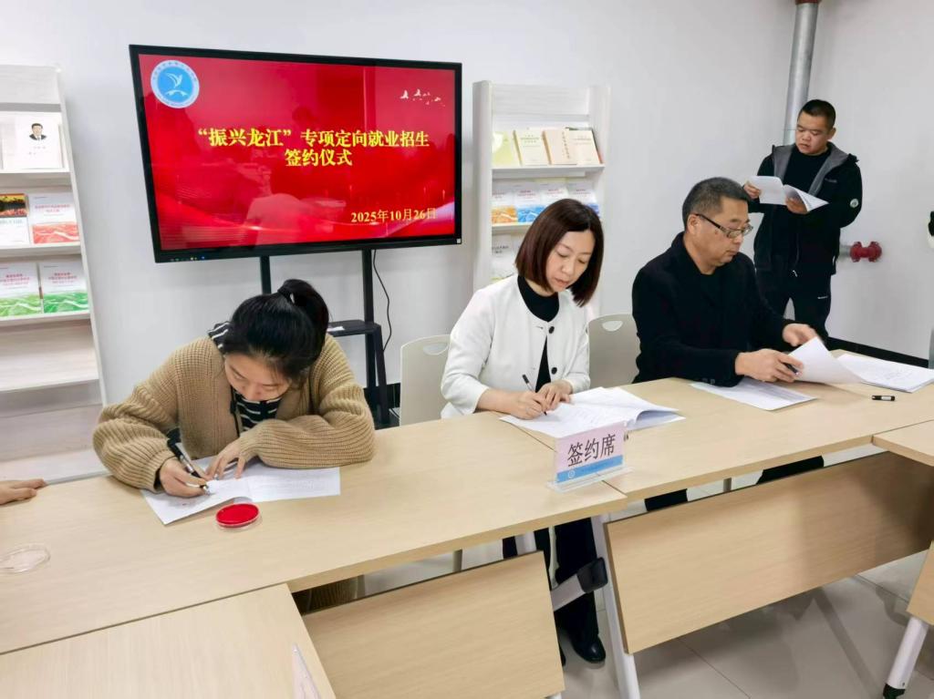 签约仪式上,招生就业处处长王勇介绍了学校办学特色以及专业优势,并对“振兴龙江”专项定向就业招生工作作了详细说明。副校长马可心分别与用人单位代表伊春市大箐山县卫健局局长潘悦军、汤旺县卫生健康局四级主任科员丁明以及27名临床系2025级学生签订了三方协议。