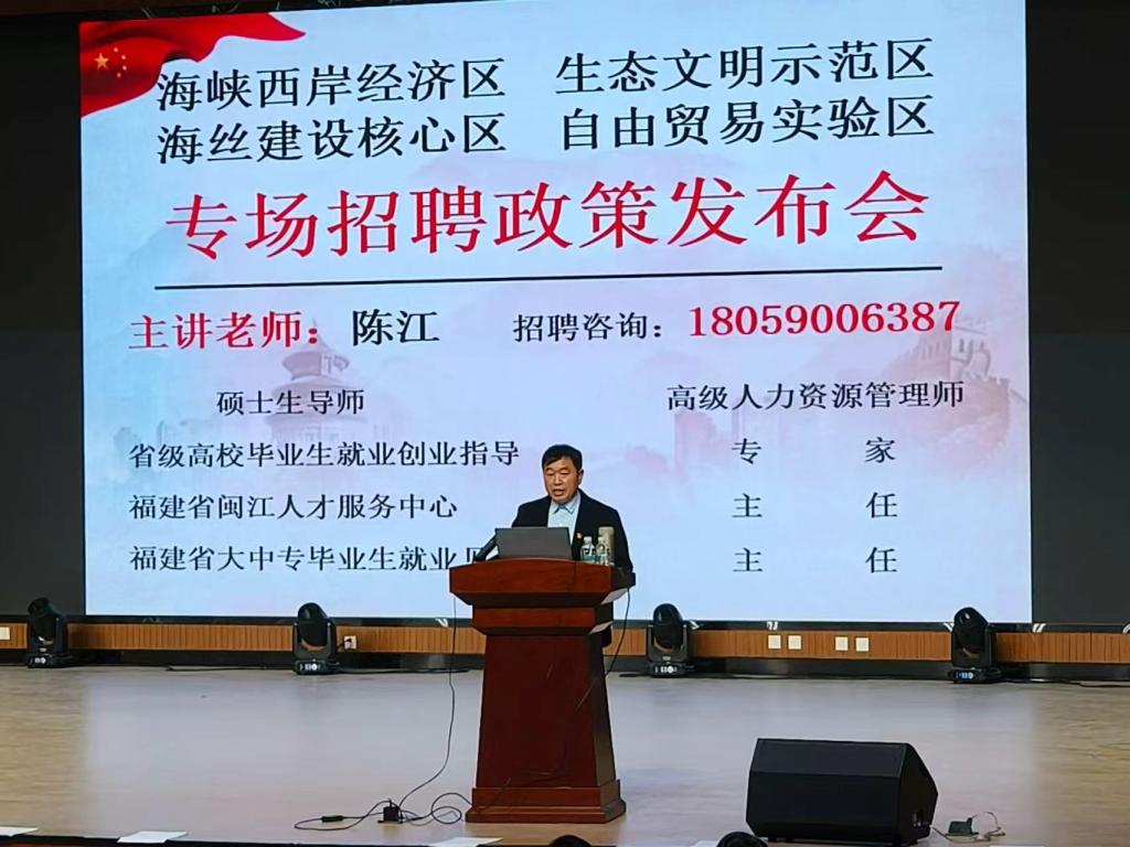 宣讲会上,福建闽江人才服务中心陈江主任详细介绍了福建的历史、经济、文化等方面的发展状况以及闽江人才服务中心概况,分析了近年来高校毕业生的就业形势,解读了福建省人才招聘的相关政策,通过视频展示了我校往届毕业生在福建学习生活,安家立业的生动案例。