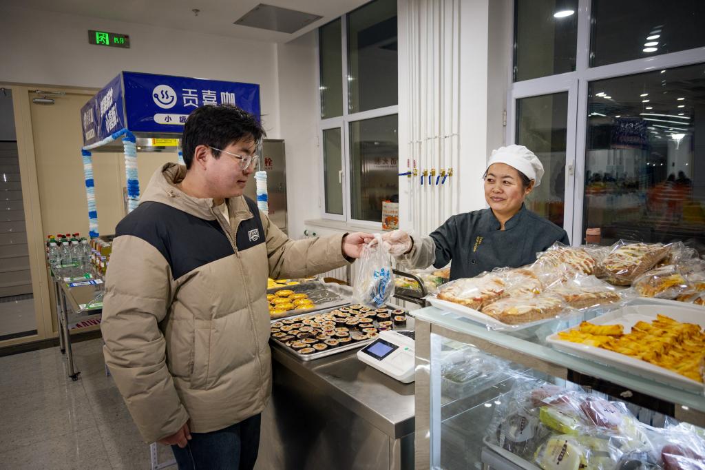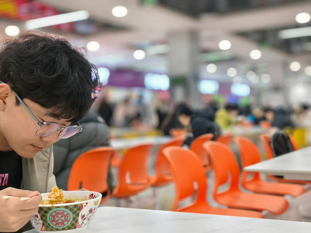 暖黄灯光笼罩的食堂窗口,甜品阿姨递出的不仅是美味的餐食,更是藏在细节里的暖意,2024 级助产 1 班葛晓乐的作品《窗口的暖意》,把这份日常定格成永恒。低头干饭的瞬间,2024 级助产 1 班赵鑫雨《食堂里的烟火时光》让热闹的三餐成为校园生活的小确幸 , 新食堂的宽敞明亮,让干饭都变得更有仪式感啦!