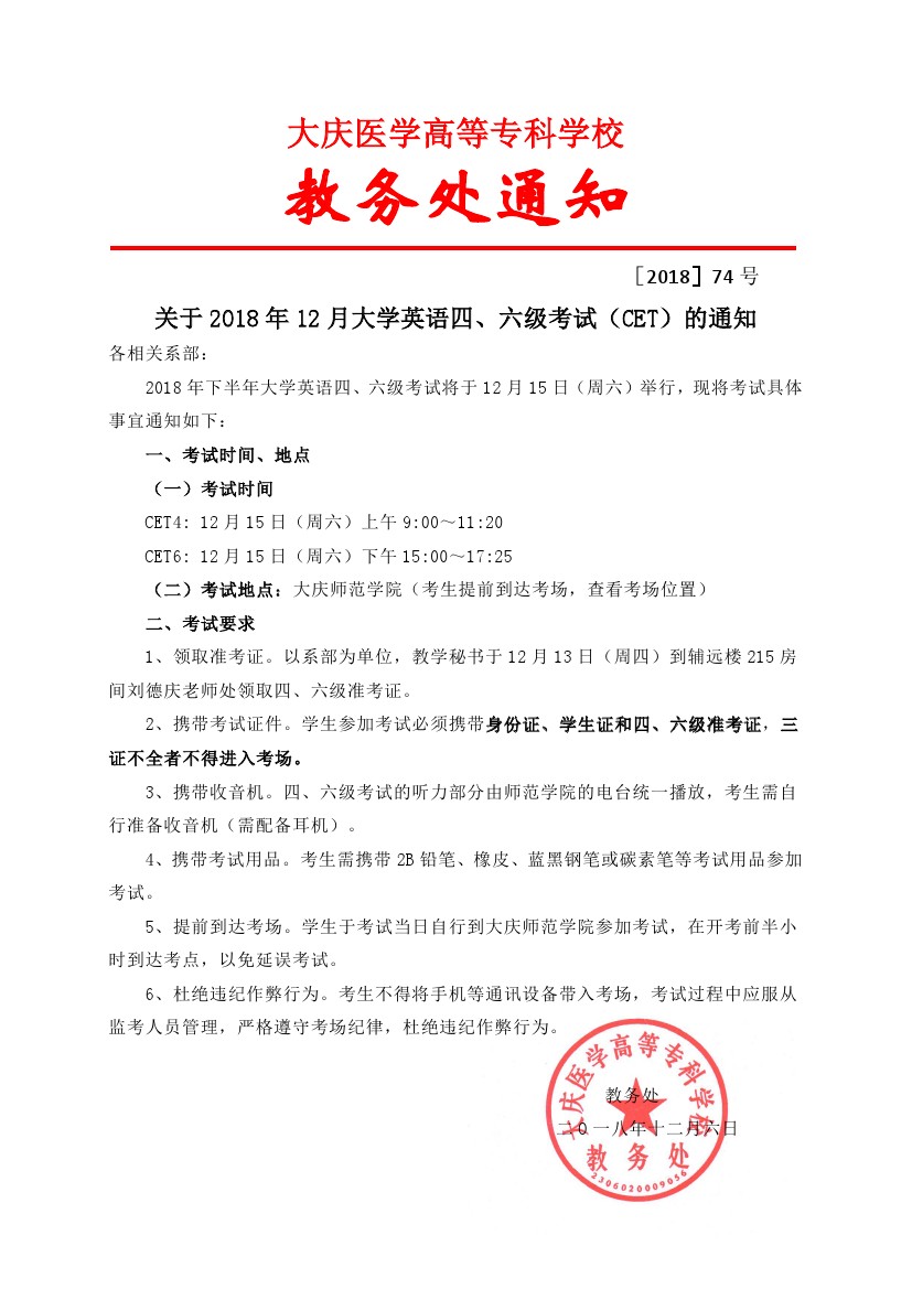 2018年12月英语四六级考试通知