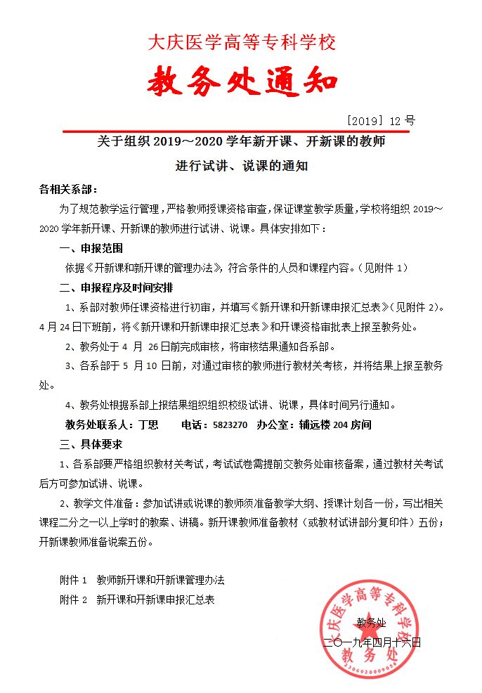 关于组织2019-2020学年试讲、说课的通知(教务2019年12号)
