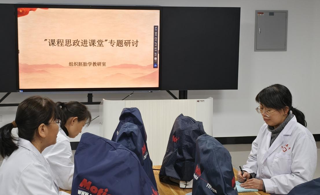 为深入贯彻落实立德树人根本任务,深化课程思政与专业教学融合,着力培养德技双馨的高素质医学人才,基础医学部组织胚胎学教研室于3月3日在组织胚胎学实训室开展了"课程思政进课堂"专题教研活动。本次研讨旨在结合组织胚胎学课程特点,探索课程思政元素的挖掘路径、融入方法及评价机制,切实将价值引领贯穿教学全过程,实现知识传授与价值引领的统一。