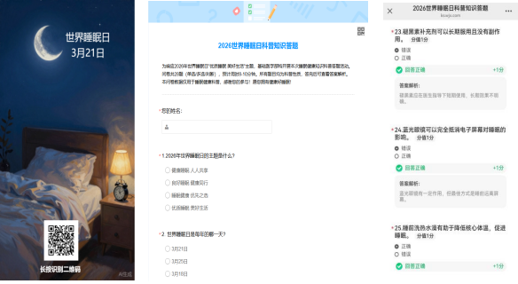 本次活动以"优质睡眠 美好生活"为主题,通过科普答题形式,旨在普及科学睡眠知识、识别常见睡眠误区及提供实用改善建议。答题涵盖世界睡眠日基本知识、健康睡眠的标准和要求、睡眠障碍的类型和危害、改善睡眠质量的科学方法四方面内容。为更好达到科普效果,活动专门设置"答案解析"页面,帮助教师深入理解答题知识点,切实掌握科学睡眠技巧。