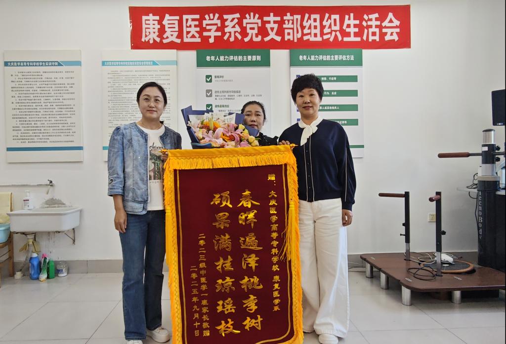 2025年9月10日,我国第41个教师节之际,大庆医学高等专科学校康复医学系收到一份特殊的礼物——2023级专科中医学1班刘宗琳淞同学的家长专程从天津赶来,向系部领导、教研室主任、辅导员及全体教师赠送五面锦旗和五束鲜花,表达对学校育人工作的诚挚感谢。
