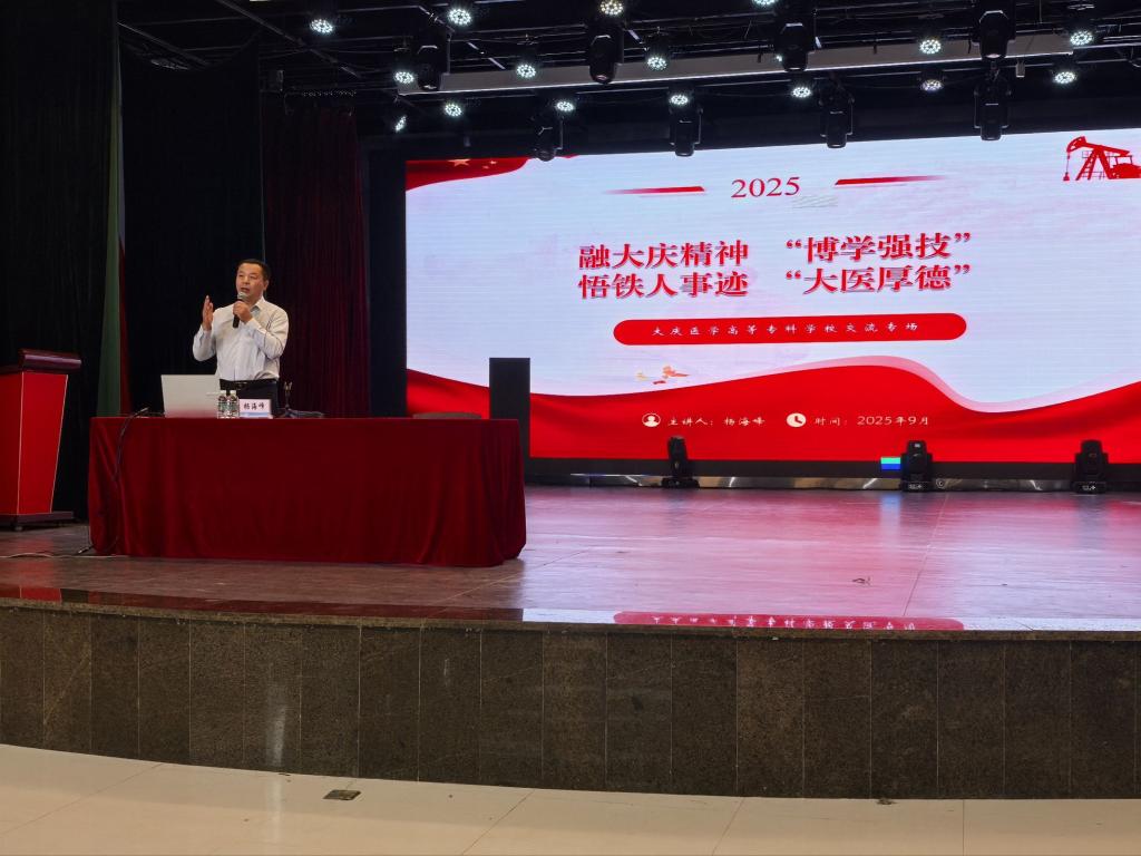 为进一步传承和弘扬大庆精神(铁人精神),厚植医学生家国情怀与职业素养,9月24日下午,我校特邀大庆市优秀教师,黑龙江省教学能手,“大庆精神铁人精神”研究会学术委员,中共大庆市委党校、漠河市委党校特聘专家,大庆市作家协会会员,黑龙江省作家协会注册会员,大庆市教育局劳动研学负责人、大庆中学机关党支部副书记杨海峰走进校园,举办了一场题为《融大庆精神“博学强技” 悟铁人事迹“大医厚德”》的专题讲座。全校师生代表齐聚现场,共同聆听这场兼具思想深度与实践指导意义的精神盛宴。